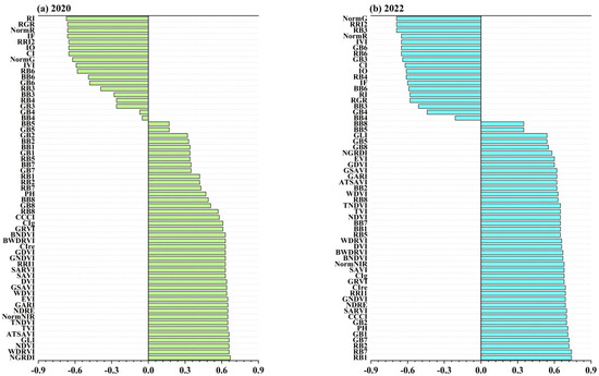 In this study, a total of 25 RGB features and 34 MS features were acquired from the relevant data sources. We conducted a Pearson correlation analysis on the 59 spectral features obtained for the years 2020 and 2022 to assess their relationships with yield.