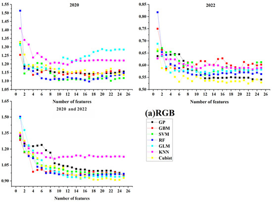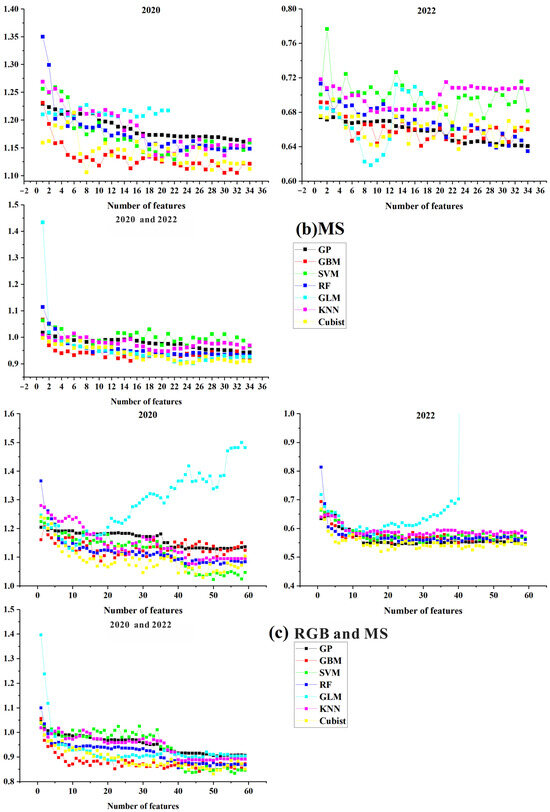 Although many spectral features showed significant and strong correlations with yield, the large number of features created in this study required a feature selection process. To streamline these for model building, we employed the RFE method. Therefore, we applied the RFE method to filter the RGB and MS features, MS features, and RGB features in the 2020, 2022, and 2020 and 2022 datasets using the seven machine learning algorithms. The RMSE regression loss of each algorithm was calculated. Figure 5 illustrates the relationship between the number of input features (on the x-axis) and the RMSE regression loss (on the y-axis). Different lines represent the variation across the folds. A lower RMSE indicates a higher prediction accuracy for the model. The optimal number of input features for each of the seven machine learning algorithms is detailed in Table 2.
