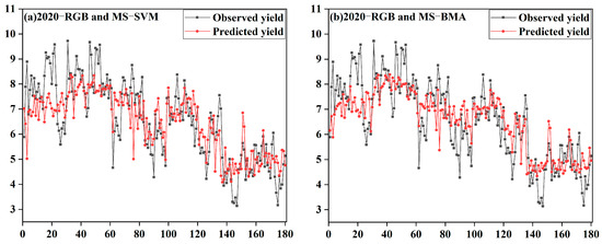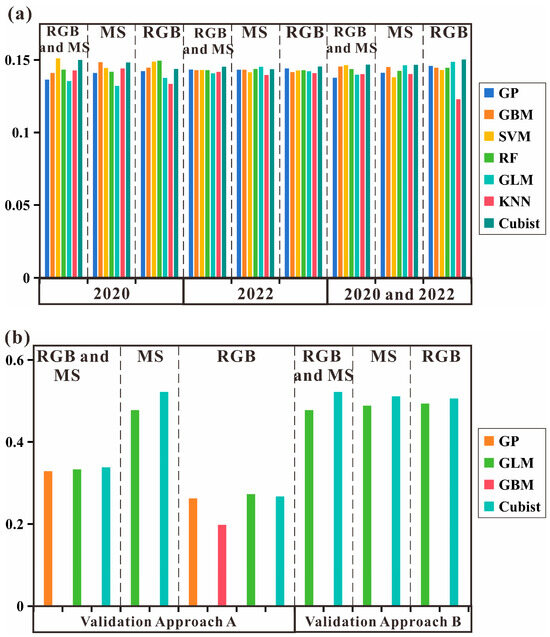 The selection and fusion of features from MS and RGB sensors offer significant advantages in scientific research. MS sensors capture data from various spectral bands, providing rich spectral features [62]. Conversely, RGB sensors offer high-resolution image information [63]. Combining features extracted from these two sensor types, we leverage their strengths to create a more accurate representation. Feature fusion amalgamates the advantages of MS and RGB sensors, enhancing prediction accuracy and stability in regression models. Most models in this study showed improved accuracy when RGB and MS features were fused, aligning with previous findings [38]. Feature fusion also addresses limitations of individual sensors [64]. These limitations include insensitivity to specific spectral bands in MS sensors and susceptibility to lighting conditions and color distortion in RGB sensors [65]. Combining features, we compensate for these shortcomings. This approach improves adaptability to different scenarios and data variations. Using fused multi-sensor features from 2020 and 2022, each model demonstrated better adaptability compared to single-sensor features, with slightly higher R2 values. Additionally, feature fusion expanded the dataset, increasing the number of input features and training samples, which improved generalization ability and stability. It is important to note that this study exclusively utilized features from two sensors. Future research can explore incorporating thermal infrared, hyperspectral, and other sensor features. This exploration aims to further enhance predictive capabilities and conduct more comprehensive investigations.