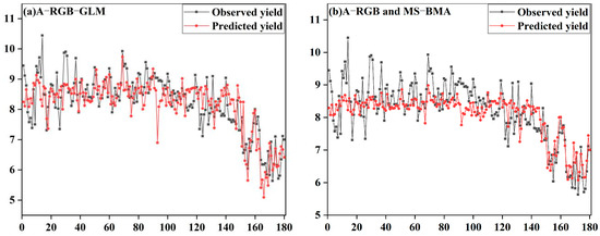 The accuracy of the seven individual machine learning models is presented in Table 4. SVM, RF, and KNN did not perform well in terms of accuracy. Their R2 values were below 0.48, and the RMSE exceeded 0.7 t·ha−1, with a maximum RMSE of 1.939 t·ha−1. The GBM model displayed some predictive capability when constructing the yield prediction model based on RGB features in validation approach A (R2 = 0.497, RMSE = 1.013 t·ha−1, MSE = 1.026 t·ha−1). In contrast, all Cubist and GLM models demonstrated reliable predictive performance, with R2 values exceeding 0.48. Among them, the Cubist model exhibited the best predictive performance (R2 = 0.634, RMSE = 0.593 t·ha−1, MSE = 0.352 t·ha−1). Overall, the models constructed using validation approach A generally exhibited higher accuracy than those using validation approach B. It was deduced that an R2 value below 0.48 may not provide reliable predictive performance. Only individual machine learning models with an R2 greater than 0.48 were used to build the BMA predictive models. Their accuracies are summarized in Table 4. Notably, the BMA models consistently outperformed any individual machine learning model. The highest prediction accuracy was achieved using validation approach A (R2 = 0.673, RMSE = 0.560 t·ha−1, MSE = 0.313 t·ha−1). Furthermore, the R2 values of the BMA models fell within the range of 0.51–0.673, while the RMSE values ranged from 0.313 to 1.170 t·ha−1, confirming the reliability of their predictive performance.