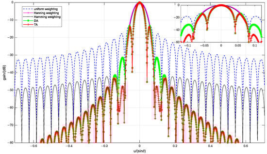 where represents the beamforming complex output obtained using the Hamming window weighting calculation. We consider a ULA consisting of 48 array elements, where the spacing between adjacent array elements is a half wavelength. The beam patterns obtained by using uniform weighting, Hanning window weighting, Hamming window weighting, DA and TA are shown in Figure 1. In Equation (7), Hanning weighting is a cosine window function when , and Hamming weighting is a special case of cosine-on-pedestal window function when . Evidently, the DA and TA have narrow main lobe widths of the sinc function and small sidelobes of the cosine-on-pedestal window function. However, with the larger number of weighting functions, the ideal sidelobe levels are still not reached, and these methods only make use of the amplitude information of the beam pattern, ignoring complex information [].