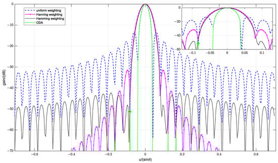 As observed from Figure 2, compared with other weighting methods, CDA obtains significantly lower sidelobes below approximately −40 dB without degrading the main lobe resolution (the position of the first sidelobe obtained by CDA labeled using the diamond shape), and has the advantages of simplicity and easy implementation.