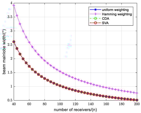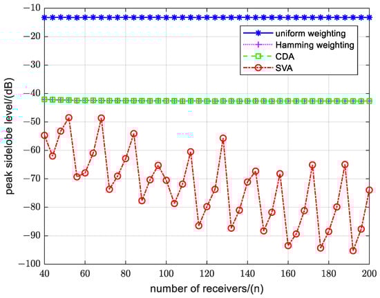 It is clear that the beam main lobe widths of the CDA and SVA are both consistent with those of the uniform weighting method with 40 to 200 receivers. Moreover, the beam peak sidelobe levels (PSLs) of the CDA and SVA are both lower at −40 dB compared to the PSL of the uniform weighting method, which is approximately −13 dB. However, the sidelobe levels are reduced with decreasing main lobe resolution via Hamming weighting.