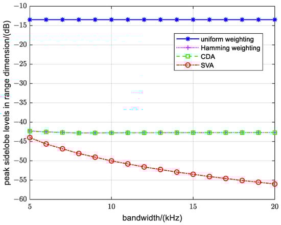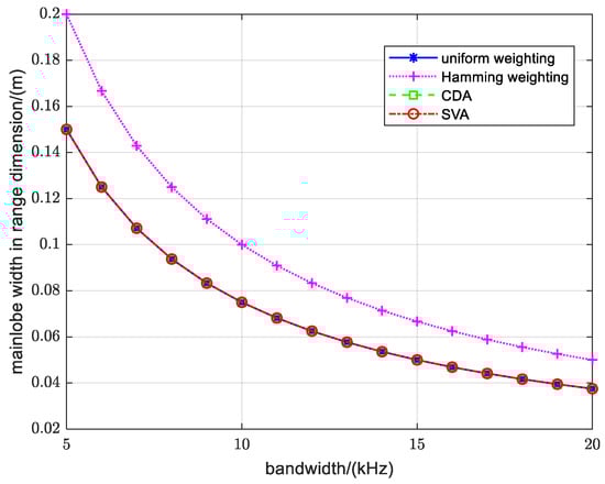 Since the carrier frequency of the imaging sonar is 80 kHz, the transmitted signal is a linear frequency modulation signal. Additionally, the pulse width is 40 ms, and the bandwidth changes from 5 kHz to 20 kHz. The outputs of matched filtering are obtained by using uniform weighting, Hamming window weighting, CDA processing, and SVA processing methods. The simulation results of the main lobe width and the peak sidelobe level are shown in Figure 7 and Figure 8, respectively.