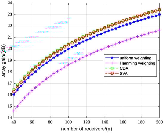 where denotes the beam power of the SVA algorithm. The array gain versus the number of receivers is simulated using uniform weighting, Hamming window weighting, CDA and SVA. The carrier frequency of the imaging sonar is 80 kHz in the simulation, and the corresponding results are shown in Figure 9. The simulation results clearly demonstrate that the AG of the uniform weighting method yields a theoretical curve, while the AG of the Hamming window weighting method decreases. Nevertheless, compared with that of the uniform weighting method, the AG of the SVA method slightly increases by approximately 0.5 dB.