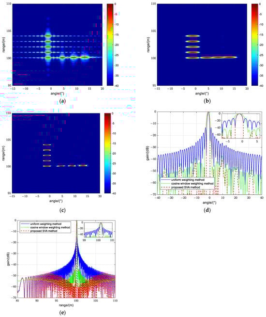 Comparison of the 2D acoustic images obtained using different processing methods: (a) simulation image obtained by the uniform weighting method; (b) simulation image obtained by the Hamming window weighting method; (c) simulation image obtained by the proposed method; (d) results in the angular dimension corresponding to a target at 104 m; (e) results in the range dimension corresponding to a target at 12°.