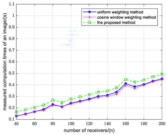 To analyze the computational burden of the proposed method, the computational times of the conventional uniform weighting method, cosine window weighting method and one-dimensional two-step SVA method are given in Figure 11, and the matrix size of the raw image is . A PC with an Intel (R) Core (TM) i7-10510U CPU @ 1.8 GHz was used, and the computation times were obtained by the MATLAB functions CLOCK and ETIME.