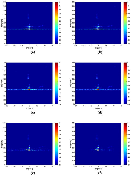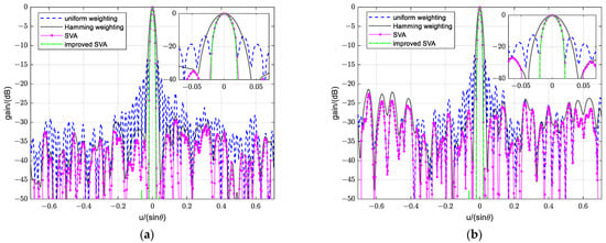 From Equation (21), the sidelobes of the beamforming results are set to exactly zero by the SVA, but the main lobes are preserved. Therefore, the sidelobes are suppressed without degrading the main lobe width in the angular dimension using the SVA method.