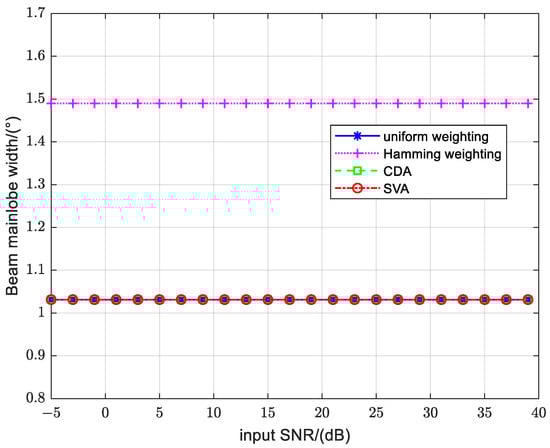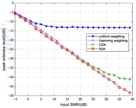 According to the results presented in Figure 13 and Figure 14, the beam main lobe widths of the proposed SVA method are consistent with those of the uniform weighting method over a wide input SNR range, while those of the Hamming weighting method are wider. When the input SNR is less than 0 dB, the peak sidelobe levels of the proposed SVA method are essentially the same as those of the uniform weighting method. With the increase in the input SNR, the peak sidelobe levels of the proposed SVA method are lower than those of the uniform weighting method. CDA shows the same performance as the proposed SVA method, but its computational burden is greater.