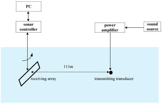 The underwater sound source is placed underwater at the same depth as the sonar array with a horizontal distance of approximately 111 m, and a view of the lake calibration experiment is shown in Figure 15. The sound source emission signal is a single-frequency short pulse when the direct wave is selected for analysis and processing.