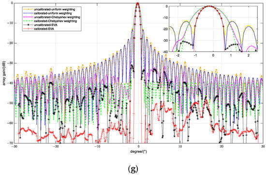 As shown in Figure 12, for both the window weighting methods and the SVA method, the performance decreases with beam sidelobe levels higher than −30 dB in the presence of array amplitude and phase errors. In contrast, the proposed improved SVA method combining the amplitude and phase error calibration method with the SVA method is not sensitive to the amplitude and phase errors, and the main side lobe ratio of the beam pattern is greater than 40 dB, indicating its high robustness.
