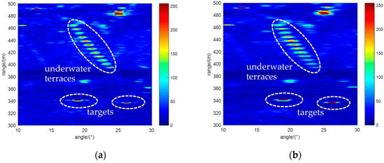 Conventional amplitude weighting cosine window functions are commonly applied to reduce the sidelobe levels with angular and range dimensions for FLSs, which may lead to the degradation of the angular and range resolutions. Compared with conventional beamforming, sonar images are obtained with lower sidelobe levels and narrower main lobe widths by utilizing adaptive beamforming (ADBF) [,,,]. Nevertheless, the performance of the ADBF methods degrades in the presence of array model mismatch due to imperfect array channels and inaccurately estimated data covariance matrices; hence, several robust adaptive beamforming algorithms have been investigated. The calculation of the adaptive weighed vector in robust adaptive beamforming is equivalent to the second-order cone programming problems, which has high complexity; furthermore, the prior knowledge of the programming problem is difficult to obtain due to complicated underwater propagation []. Moreover, for forward-looking imaging sonar, these existing adaptive beamforming approaches are not applicable to the output in the range dimension. Thus, robust adaptive beamforming cannot be easily used to obtain lower sidelobe levels for forward-looking sonar imaging.