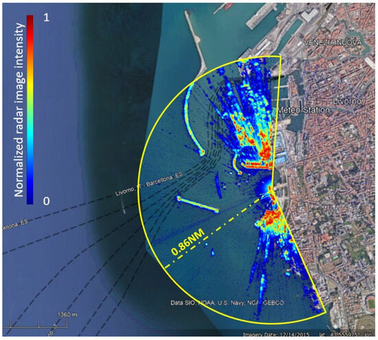 The measurement campaigns were carried out in the stretch of sea located immediately south of the main entrance to the Livorno harbor. This stretch of sea has a radius of approximately 0.86 nautical miles and features persistently intense maritime traffic and numerous signals (beacons, lighthouses, buoys, etc.) warning of navigation hazards. Figure 2 shows an aerial view of the survey area overlaid with the corresponding radar image on a color scale (from blue to red) as a function of the intensity of the radar signal received from the targets normalized with respect to the maximum value. In particular, blue is associated with low intensity, and red with high intensity.