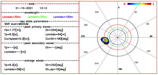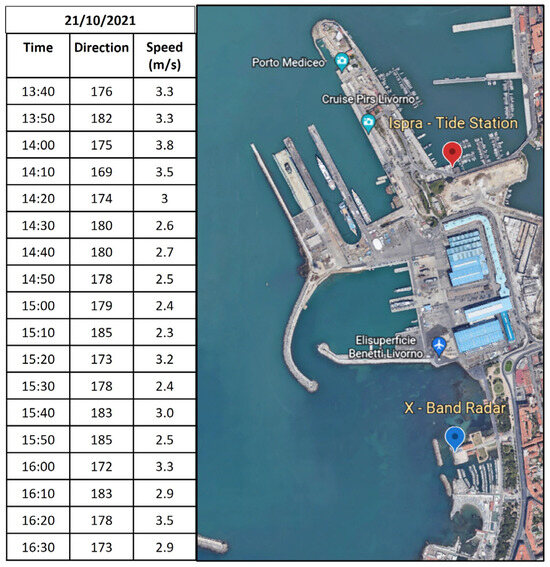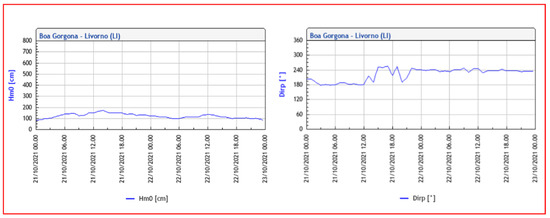 Figure 5 shows plots of the average wave height and direction of the waves recorded by the Tuscany regional meteorological center’s Gorgona wave buoy from midnight on 21 October 2021 (the date of the second survey campaign) to midnight on 23 October 2021, which substantially confirm the wave radar measurements. The wave buoy is located about 17 nautical miles from the survey area at the coordinates LAT: 43°34′11.99″N and LON: 9°57′25.21″E.