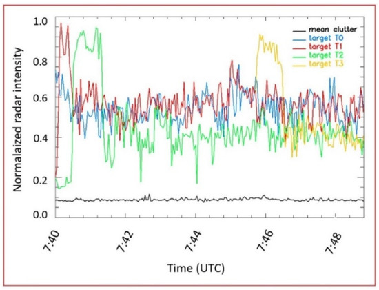 As regards X-band radar’s ability to identify and recognize SGI modules, this study found that with the calm seas and almost no wind in the first measurement campaign, targets T0, T1, T2 and T3 were all clearly visible from the radar data and were easily distinguished from average sea clutter (Figure 8).