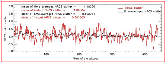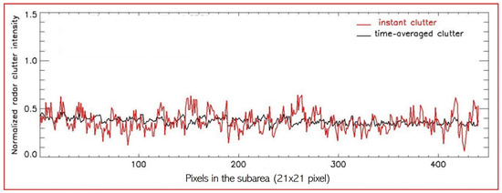 This is confirmed by Figure 9, where the clutter level in the instantaneous radar image obtained with the procedure used in the first campaign (and represented in this case in terms of the NRCS) is so high that it does not allow the targets to be distinguished (the instantaneous target NRCS falls within the range of variation of the instantaneous clutter NRCS). By contrast, the targets are clearly visible in Figure 10 for the first release (0.12 NM) and Figure 16 for the second release (0.27 NM), which depicts the time-averaged radar image, as their NRCSs are higher than the time-averaged NRCS clutter.