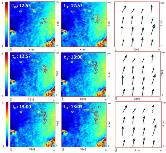 T0 and T1 target movements during the second measurement campaign were also analyzed. Similar to the first measurement campaign [51], the analysis of the target movement was also compared with the field of surface currents measured by the radar system (for the method used to estimate surface currents from X-band radar data, see [58]). The movements of targets T0 and T1 were measured from radar images for different instants of time. Figure 19 shows target movements between time instants ti0–ti1, ti1–ti2 and ti2–ti3 (the first two columns on the left). The red arrows in the figures indicate target movements from one instant to the next. The third column from the left shows the current field in the survey area provided by the wave radar system for the time interval in question (for the method used to estimate surface currents from X-band radar data, see [58]). This current measurement was generated by averaging the module of the current intensity in the survey area, eliminating the spikes above double the average and below half the average. The calculated average speed and direction of the current in the survey area were 0.17 m/s and 0.18°N, respectively. As can be inferred from the figure, target movements tend to follow those of the surface currents very closely in the rough sea conditions found in the second measurement campaign.