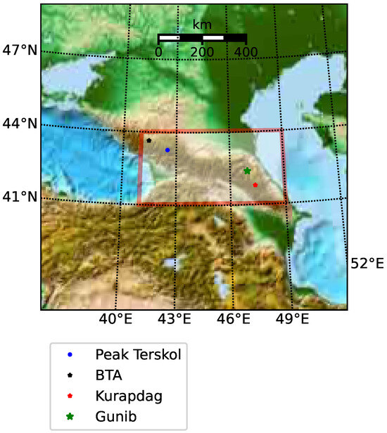 The present study focuses on the simulation of optical turbulence above the Peak Terskol Observatory (43.27472°N 42.50083°E, 3127 m a.s.l.) and Mt. Kurapdag (41.79609°N, 47.37428°E, 3553 m a.s.l.). These sites were chosen as reference locations due to the availability of special atmospheric measurements data [27]. Figure 1 illustrates the locations of the Terskol Peak Observatory, known for its high astroclimatic characteristics, Mount Kurapdag, characterized by low water vapor content [28], and the Big Telescope Alt-Azimuthal Telescope (BTA), the largest optical telescope with a non-segmented mirror in Eurasia [29]. Recent studies show that new suitable locations for ground-based telescopes include mountain regions of Dagestan. In this regard, the figure shows the location of the mountain village of Gunib as a place with potentially high characteristics.