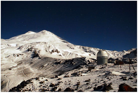 - Panchuk, V.E.; Afanas’ev, V.L. Astroclimate of Northern Caucasus-myths and reality. Astrophys. Bull. 2011, 66, 233–254. [Google Scholar] [CrossRef]