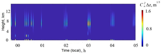 Analyzing these figures, we can see that pronounced turbulent layers are formed at heights of 7–8 km and 2–2.5 km above the ground. The turbulent layer at these heights leads to a significant decrease in image quality. For example, the parameter determined by the integral over height increases from 0.63 to . These changes are mainly due to generation of intensive turbulent fluctuations of air refractive index within these layers.