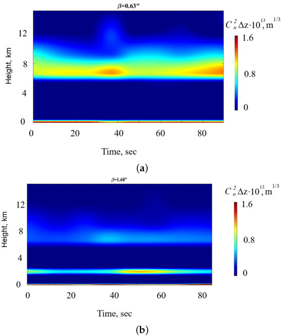 Night-time vertical distributions of optical turbulence strength at the Peak Terskol Observatory for (a) the best ( = ) and (b) the worst atmospheric conditions ( = ), 19 March 2023. In the figure, we used a local time.