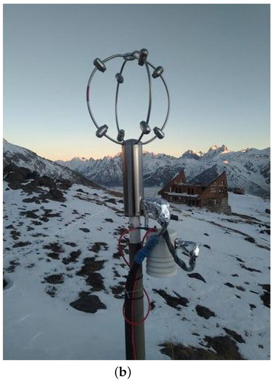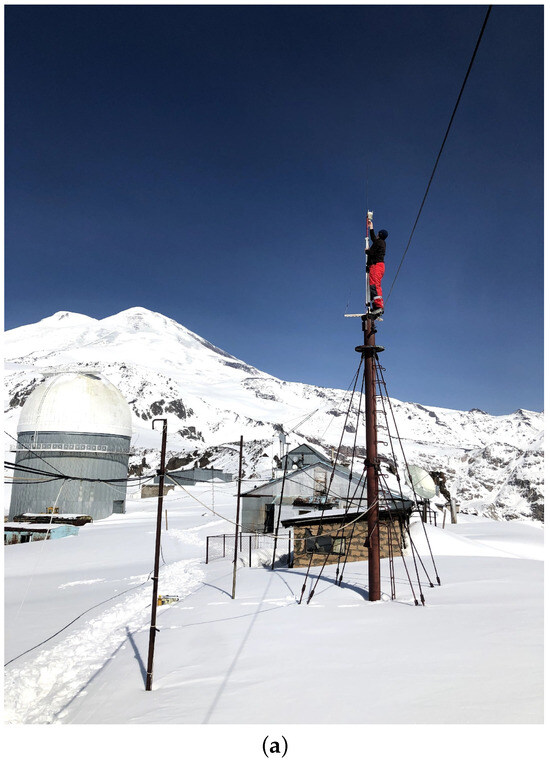 The lower part of the atmospheric boundary layer is known to make a major contribution to the formation of integral optical turbulence (along line of sight) and, as a consequence, to the resolving power of ground-based telescope [35,36]. Within this layer, variations in the intensity of optical turbulence are most poorly described, both in time and in height. At the very least, the accuracy of estimating and forecasting optical turbulence based on standard atmospheric models or limited optical remote measurement data is insufficient for planning observation times. In order to obtain the correct shape of optical turbulence profiles within the lowest atmospheric layers under the different atmospheric conditions, we analyzed measurement data carried out with a sonic anemometer. The sonic anemometer “Meteo-2” was placed on a 7-m meteorological mast at the Peak Terskol Observatory site (Figure 5). The observatory is located in the vicinity of the Elbrus, on a flat platform at an altitude of 3100 m above sea level.