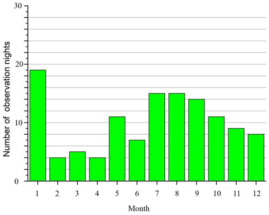Based on the 1-year measurements with the sonic anemometer, the 3-min average values of were obtained [37]. In Figure 6, we present the number of nights of sonic measurements for each month. The fewest number of nights analyzed occurs in February–April. The largest number corresponds to January as well as the warm period of observations.