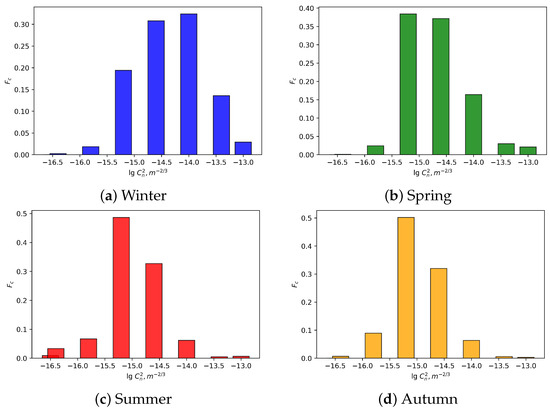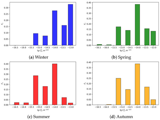 Distributions of measured values of within the surface layer of the atmosphere for different seasons at the Peak Terskol Observatory site are depicted in Figure 7 and Figure 8.