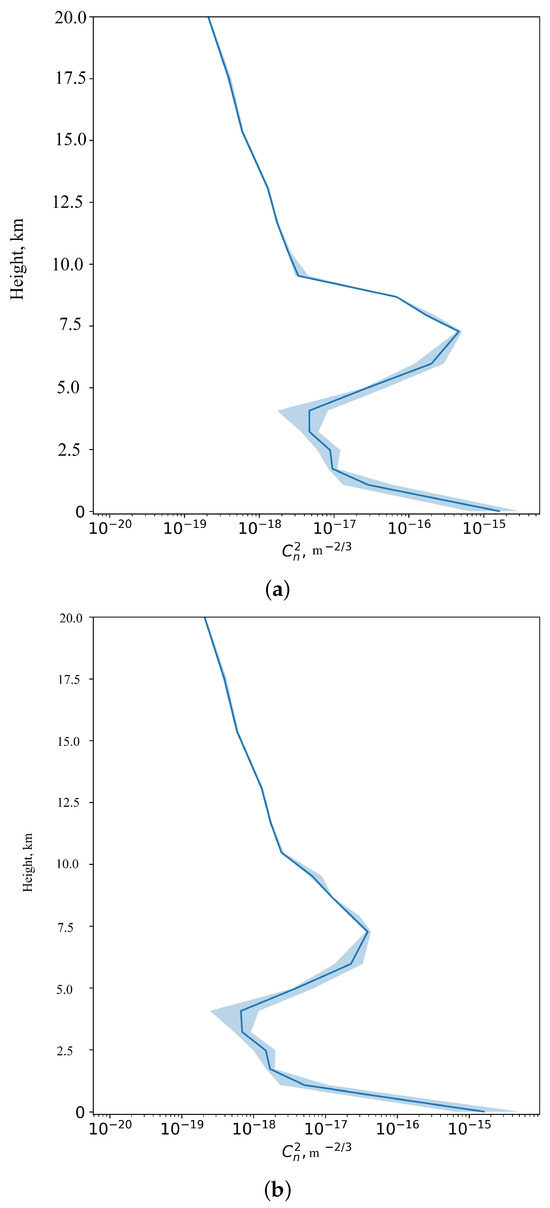 Calculated vertical profile of optical turbulence at the Peak Terskol Observatory, 18–19 March 2023. Shading corresponds to the interval between the first and the third quartiles estimated for all nights in March 2023. (a) a = 1.64, b = 42, = 5.66 cm, = 1.79 arc sec; (b) = 0.95, = 10, = 8.20 cm, = 1.23 arc sec.