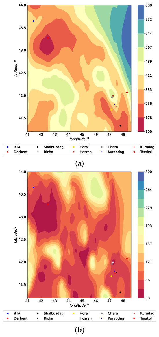 Distributions of atmospheric boundary layer height (in meters) within the Peak Terskol Observatory region. (a) Average atmospheric conditions, 2013–2023; (b) 19 March 2023.