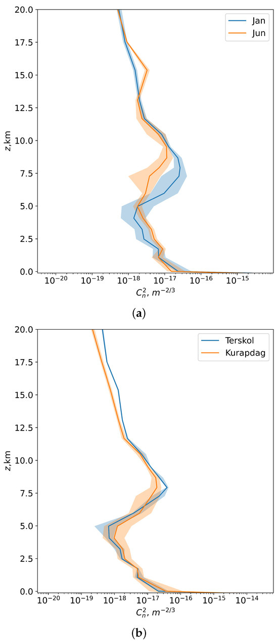 Night-time vertical profiles of optical turbulence above the Peak Terskol Observatory and Mt. Kurapdag. (a) Peak Terskol Observatory, 2023. The blue line corresponds to January. The orange line corresponds to June. The shading corresponds to the interval between the first and the third quartiles; (b) Mt. Kurapdag, 2013–2023. The blue line corresponds to the Peak Terskol Observatory. The orange line corresponds to Mt. Kurapdag. The shading corresponds to the interval between the first and the third quartiles.