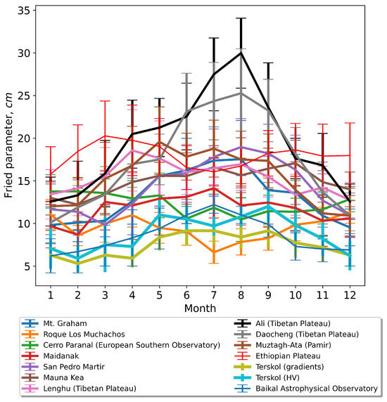 We also compare the variation of the Fried parameter at the site of Peak Terskol Observatory. The figure also shows variations of the Fried parameter at the Terskol Peak Observatory. As demonstrated in the figure, the site of Terskol Peak has a high image quality, close to that of the best places in the world. In particular, in summer, is about 1.0–. In terms of , these values correspond to 8.3–10.0 cm. In addition to the average monthly values of the Fried parameter obtained using the gradient method, the figure shows the results of applying the Hufnagel–Vally (HV) climate model to describe vertical changes in [41]. The HV model is based on the processing of experimental data and, on average, describes the structure of optical turbulence well. Nevertheless, detailed information about the vertical distribution of optical turbulence cannot be reflected using this model. Analysis of the figure shows that the gradient model and the model give similar results in terms of .