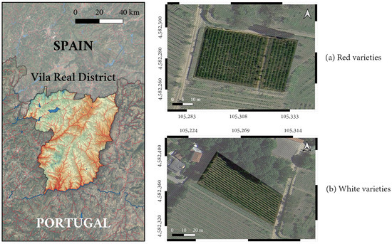 The vineyards used as study areas in this work are situated in the northern region of Portugal, specifically in Vila Real (Figure 1). Each vineyard plot is dedicated to either red or white grapevine variants, and each grapevine variety is cultivated in one or more contiguous rows. The names of the row varieties were visible at the ground level via human-made marks, and these were annotated for the individual classification of rows visible in aerial imagery. The first crop (a) extends over 0.1551 and the second one (b) covers an area of 0.2814 .