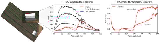 This section briefly describes the process of obtaining reflectance data from raw hyperspectral imagery, illustrated in Figure 2. The hyperspectral data were collected using a drone and processed using Headwall SpectralView™ software (v3.1.5.1, Headwall Photonics, Inc., Bolton, MA, USA). Several swaths were captured for each study area, and a white sample was marked from the white area in a grayscale tarp, while a dark reference was obtained by collecting a hyperspectral sample with the lens cap on before the flight. The sensor exposure and frame period were adjusted before the flight by pointing at a bright reference to avoid clamping samples from white surfaces. The white and dark references were then used to convert the raw data to reflectance. The ortho-rectified swath in Figure 2 was obtained using high-resolution DEMs (25 ) from Copernicus’s observation program [71] and the drone’s GPS and IMU data. However, non-ortho-rectified swaths were used for the analyses presented in this paper to work with smaller image sizes and avoid distorting the hyperspectral signatures.