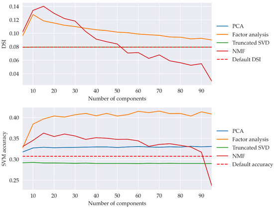 Results of experiments conducted to compare different feature transformation algorithms with different numbers of components. PCA, FA, NMF and LSA (truncated SVD) are evaluated using the DSI metric and the OA obtained by training an SVM model. The default DSI and accuracy are obtained from the original data with 140 features.