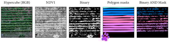 Workflow for manually labelling HSI swaths. First, the false RGB image is displayed. Then, the NDVI is extracted, followed by thresholding and marking with polygons using the Sensarea software. Finally, a Boolean operation, AND, is performed between the polygon and binary masks to obtain the final labelled regions.