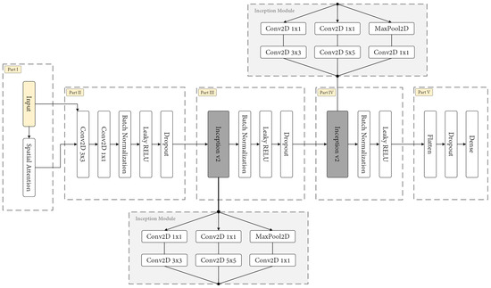 Then, two similar blocks are included as Part II and Part III in Figure 7. Both share the same structure: inception block, normalization, activation and dropout. This is a frequent follow-up of convolutional layers [68,78], with dropout being greater (0.4) for middle layers than the last and initial layers (0.2). Instead of using max-pooling to downsample the network, strides of size 2 in convolutional layers were observed to perform better. These blocks are particularly well suited to our case study, as variations in flight altitude and image resolution are common among different observations. Consequently, employing inception blocks with kernels of varying sizes demonstrates robust performance against these uncertainties. The network specifications are shown in Table 2.