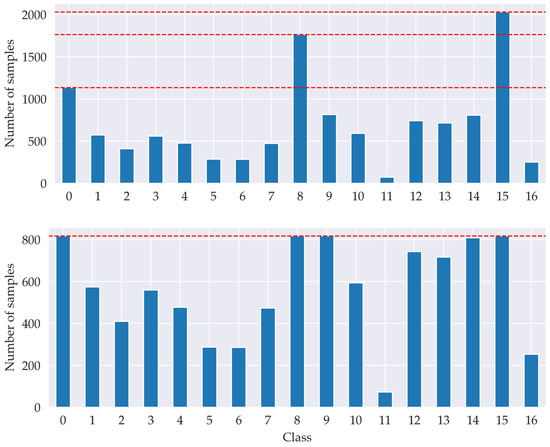 From top to bottom: initial distribution of samples per label and after using the proposed narrowing, with only three groups being downsampled.