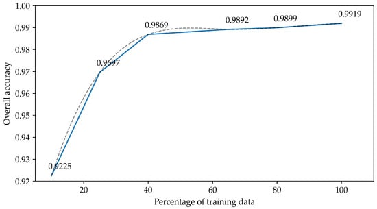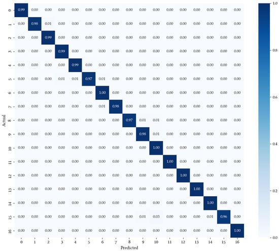 Table 4 shows the overall results of our method in comparison with state-of-the-art networks for classifying HSI datasets. Most of them are considerably unstable due to operating with noisy UAV data rather than working with satellite imagery. In addition, the second-best-performing network is Nezami et al.’s [59], which is the only one checked against UAV datasets for discerning different tree species. Similar to ours, it is also a shallow CNN with only a few layers; however, convolutions are applied sequentially rather than operating with stacked features extracted from various parallel convolutions. The confusion matrix in Figure 9 shows the OA of the proposed network against any grape variety. Hence, classification over the majority of varieties shows uniform results, with most of them being close to 99%. Note that these percentages were rounded, and therefore, some of these results are below 99%, while others are above. When averaged, all these results lead to an OA of ≈%, as shown in Table 4.