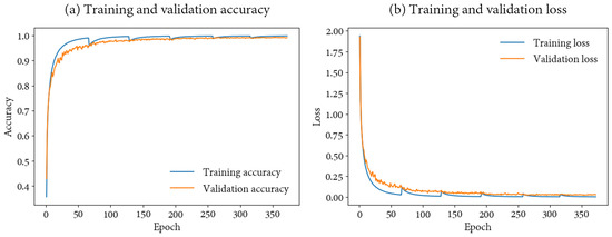 Trainable CNN layers are typically defined by a matrix of weights and biases applied over input data, , with f being an activation function that allows the solving of nonlinear problems. In this work, ReLU and Leaky ReLU are applied to tackle the vanishing gradient problem, together with batch standardization. The latter operations work similarly to the standardizer applied as a preprocessing stage. On the other hand, w and b are updated during training to minimize a loss function comparing ground-truth and predicted values for supervised classification. This is performed by an optimizer that changes these trainable parameters using the error gradient scaled by the learning rate, . The greater the , the faster the convergence is achieved, though it can also lead to significant oscillations. This process is known as gradient descent (GD) [77]. As faster convergence may be necessary at the beginning, the decay and momentum concepts were introduced to downscale during training, thereby omitting abrupt changes.