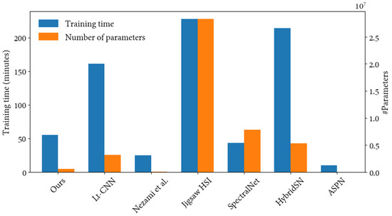 Nevertheless, some of these applications formulate a binary problem where signatures of distinct classes significantly differ in scale and shape. Others operate with small datasets obtained on land via close sensing [58] or from imagery acquired at higher altitudes (hence showing more recognizable spatial features). For instance, a lightweight CNN composed of several inception blocks was also developed to classify up to 15 plant species [58] using multispectral images with a size of at least pixels. The authors found that the best results were achieved using a combination of six RGB and near-infrared features, with an accuracy of 94.7%. The use of PCA with only six features achieved an accuracy of 88%. Nezami et al. [59] also applied a 3D CNN to classify three tree species using both hyperspectral and visible imaging as well as canopy height models as input, with an OA below 95%. While it performs well over notably different materials, the network is not complex enough to discriminate similar hyperspectral signatures. On the other hand, transfer learning, attention-based and residual models are commonly observed in the literature [60]. Zhou et al. [61] delved into the realm of CNNs trained on distinct domains for satellite HSI classification, augmented with few-shot learning techniques. Although not yet attaining state-of-the-art performance, this approach showcased promise in expediting training procedures [62].