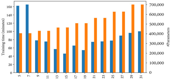 Regarding implementation, all the tests were performed on a PC with AMD Ryzen Threadripper 3970X 3.6 GHz, 256 GB RAM, Nvidia RTX A6000 GPU and Windows 10 OS. The proposed CNN as well as the compared networks were implemented with Keras (version 2.10.0) and TensorFlow (version 2.10.1) in Python. CUDA 11.8 and CuNN 8.6 were installed to reduce the fitting time. Not every network from previous work could be applied as published; for example, LtCNN is designed for large image patches (), and thus, convolutional striding and max-pooling cannot be applied when patches reach a size of . For LtCNN [29], kernel size and max-pooling’s strides were reduced as reflected in our repository (please, see Data Availability Statement).
