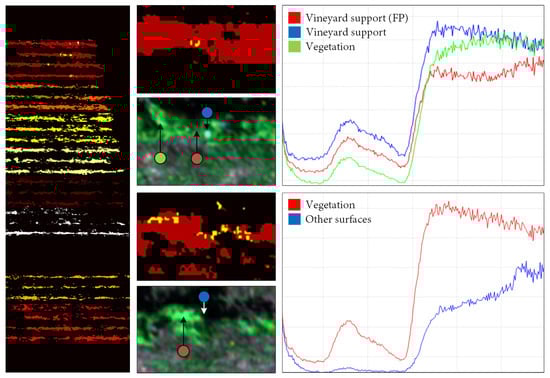Furthermore, feature transformation algorithms, such as FA, help to perform material unmixing to make the processing more robust against different background surfaces, including soil, low vegetation and other human-made structures. Pixels from UAV-based hyperspectral swaths depict more than one material. Therefore, the classification of these data ought to work under different kinds of surfaces. As proposed in recent work, material unmixing could be performed with NMF. To this end, hyperspectral swaths in reflectance units could be flattened to 1D () with a dimensionality of , where m is the number of features. Then, this flattened vector could be transformed into weight () and component () matrices, where c is the number of target surfaces (end-members). However, the number of materials visible in a single image (or vineyard varieties plus ground) is not known in nature. Hence, material unmixing with an unknown number of target materials is suited for the classification of significantly different signatures rather than for performing fine-grained classification as in our case study. On the other hand, the feature space can be transformed and narrowed to a few more representative features instead of unmixing materials. In this regard, FA is also aimed at decomposing A into without the non-negative restriction, with being the measurement error [74]. For this reason, FA was proven to be highly suitable to our case study, beyond outperforming the rest of the feature transformation methods in terms of separability and classification accuracy using an SVM model.