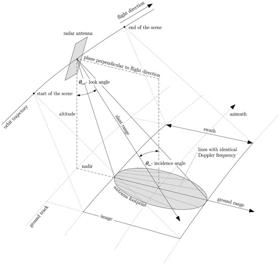 There are several other imaging modes available, depending on the satellite platform [3]. Among them, Terrain Observation with Progressive Scans (TOPS) mode has gained importance as it is the most efficient mode for mapping large areas [4,5,6]. The TOPS mode is considered a modification of the ScanSAR imaging mode [1]. With progressive scans in azimuth, it represents a primary acquisition mode (interferometric wide swath—IW) of the Sentinel-1 satellite due to its wide-area coverage capabilities. Unlike nadir-looking radar altimeters, the side-looking geometry provides range sensitivity and avoids ambiguous reflections since there is no spatial resolution directly under the platform. A radar onboard the satellite points its antenna directly to the Earth’s surface in a plane perpendicular to the flight direction. The position of the sensing instrument can be defined by a set of main geometric parameters that are depicted in Figure 1.