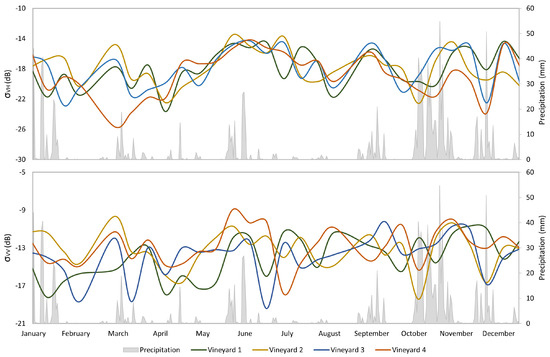 To demonstrate the applicability of SAR backscatter characteristics in vineyard monitoring throughout the year, temporal observations conducted at four vineyards in the Douro region of Portugal were used. For this, 28 ground range detected (GRD) SAR images acquired by the Sentinel-1A satellite in interferometric wide swath (IW) mode were used. These images were acquired during the period from January 2023 to December 2023 and are from the same acquisition track (52). All images are descending and feature VV and VH polarizations. Each of these images was processed by applying thermal noise removal, the precise orbit file, calibration, terrain correction, and conversion from linear to dB. At the end, and at four different points (vineyards) over 2023 were determined. The results showed that the and backscatter from Sentinel-1 responds distinctly to various aspects of vineyards, such as grapevine canopy development and precipitation occurrences, as depicted in Figure 2. The time series of tends to be higher than , although both respond to precipitation events and grapevine growth stages. During higher precipitation periods in January, March, November, and December, there was an increase in the backscatter response, suggesting a correlation with radar sensitivity to precipitation and associated soil moisture conditions. On the other hand, backscatter demonstrated greater sensitivity to volume scattering from plants compared to , showing an increasing response from April until the end of October. This period coincides with the active vegetative periods (flowering, maturation, harvesting) and subsequent leaf fall.
