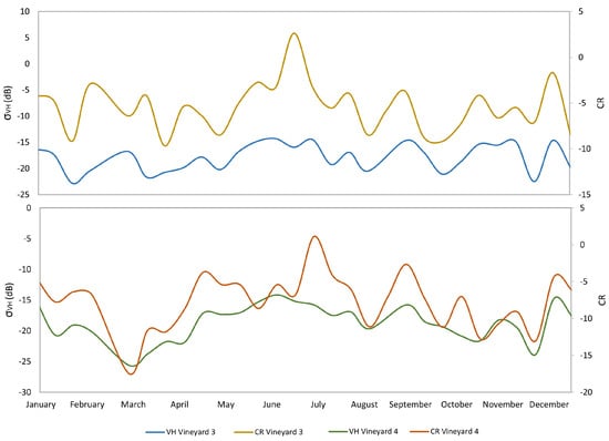 Time series of Sentinel-1A backscatter and CR for two vineyards (vineyards 3 and 4).