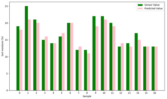 The prediction of soil moisture samples based on Sentinel-1 and Sentinel-2 is presented in Figure 4. The model employed in this study relies on Sentinel-1 SAR backscatter data and water and vegetation indices derived from Sentinel-2 optical satellite imagery. The SAR data used consists of 60 series of IW level-1 GRD from three acquisition tracks (52, 125, and 147). SAR backscatter data were processed to create synthetic bands based on combinations of VV and VH polarizations from Sentinel-1. Synthetic bands were derived for Beta0, Gamma0, Sigma0 with terrain correction, and Gamma0 with terrain flattening. With optical data from Sentinel-2, the Normalized Difference Water Index (NDWI) [65,66], Normalized Difference Infrared Index (NDII) [67], and NDVI [68] were calculated. These values were extracted using the mean of a 3 × 3 window centered at each geographical coordinate. The geographical coordinates for point extraction were the same as for the sensors, placed in two vineyards. To construct the predictive model, a regression model was built using an artificial neural network (ANN) comprising six hidden layers. The main objective was to forecast soil moisture values relying solely on remote sensing data from Sentinel-1 and Sentinel-2. Following model training and validation, the predicted soil moisture values were compared against those measured by the on-site sensors. The evaluation yielded a coefficient of determination of 0.857 and a mean absolute percent error of 6.199.