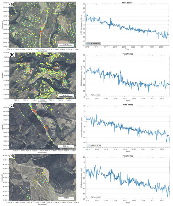 The area of interest covers approximately 100 by 60 km (≈6000 km2) (Figure 5). A total of 420 SAR images spanning 9 years of observations (27 October 2014–21 November 2023) were analyzed by persistent scatterer interferometry (PSI) technique [72,73] implemented in SARproZ software [90]. All available single-look complex (SLC) images were co-registered on the sampling grid of a primary acquisition (28 June 2021) and were selected by optimizing the distribution of perpendicular and temporal baselines and assessing weather conditions [91]. The data were analyzed on a pixel-by-pixel basis to identify a sparse grid of points, typically corresponding to man-made structures (e.g., retaining vineyard walls, roads, buildings, etc.). Precise orbit ephemerides (POE) and the SRTM-3 digital elevation model were used for the processing. A threshold of 0.65 on the amplitude stability index (ASI) was used to create a network of pre-selected points for estimating preliminary parameters and the atmospheric phase screen (APS). After APS compensation, the residual height, displacement velocity, and displacement time series were estimated with respect to a reference point selected in a scatterer with high amplitude stability (ASI > 0.9), located at 41.17148408°N latitude, −7.35213141°W longitude. A displacement map with estimated mean line-of-sight velocities is shown in Figure 5. The impact of ground motion on vineyard areas and the surrounding infrastructure can be monitored at approximately 1.2 million persistent scattering points over the entire Douro wine region. Examples from PSI deformation monitoring are shown for the infrastructure (Figure 6a,c) and vineyard areas (Figure 6b,d).
