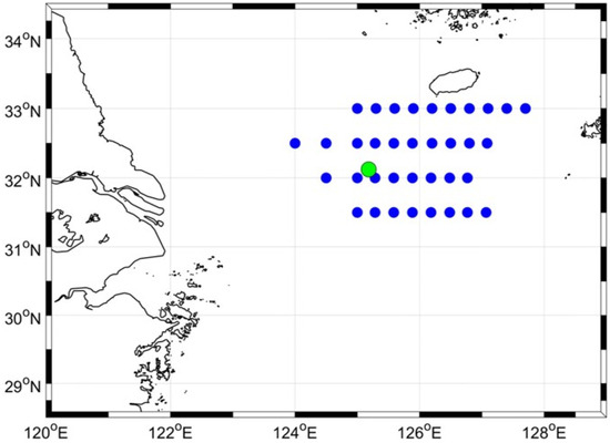 The East China Sea (ECS) study area and the in situ data collection sites used in this study. The green circle represents the Ieodo Ocean Research Station’s location (32.12°N and 125.18°S), and the blue circles depict the distribution of serial oceanographic observation data collected in August 2020 and 2021.