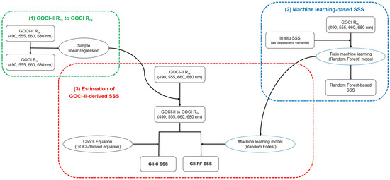 Flow chart for the procedural steps for estimating the SSS from GOCI-II data. Choi’s equation is represented as a multilinear regression equation used to estimate the SSS in the ECS using GOCI data, as explained in Section 3.2. ‘GII-C SSS’ is the SSS derived from GOCI-II using Choi’s equation, whereas ‘GII-RF SSS’ indicates the SSS derived from GOCI-II using the machine learning model.
